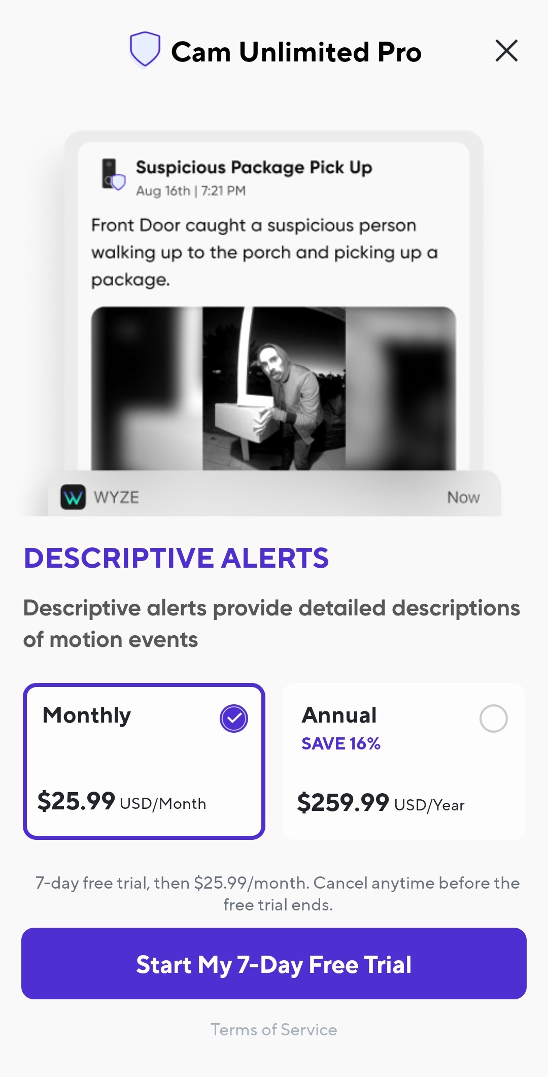 So I’ve been a Wyze camera user since 2019. Inspired by the potential of smart camera Capability & teased by AI. So I was a cam plus subscriber from the start currently an unlimited subscriber but I’m done. Too many premises no real results. Tired of responding to waving tree shadows & flashing lights 90+% of alerts a false. The wife made me turn off Alexa alerts. LOL now you want to charge 259 for descriptive alerts of waving trees identified as a person……nah