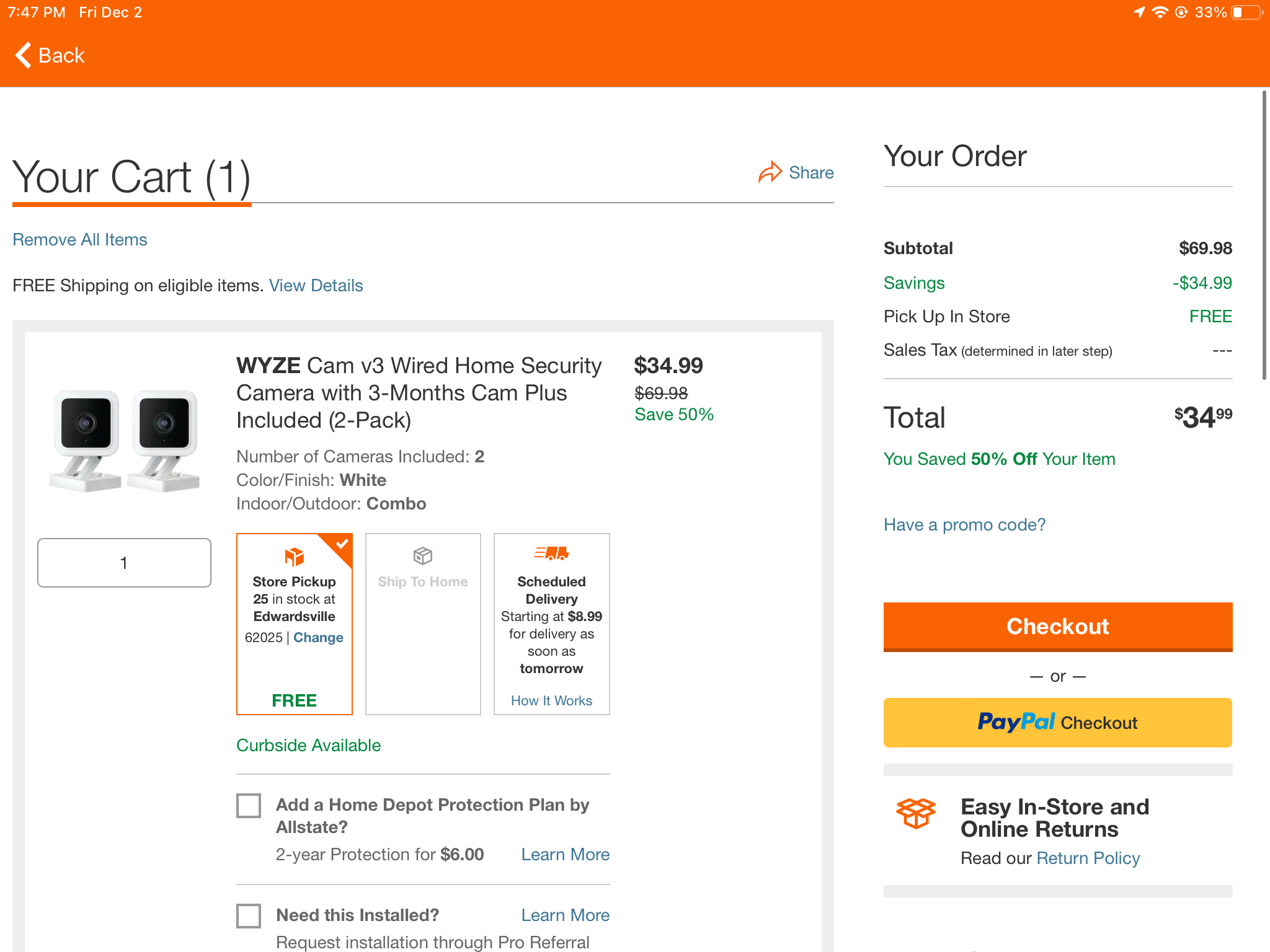 I used PayPal to pay for the cams. That order was cancelled. Remembered I had a Home Depot account from when they did our kitchen, front door, patio door, flooring, and who knows what else.
