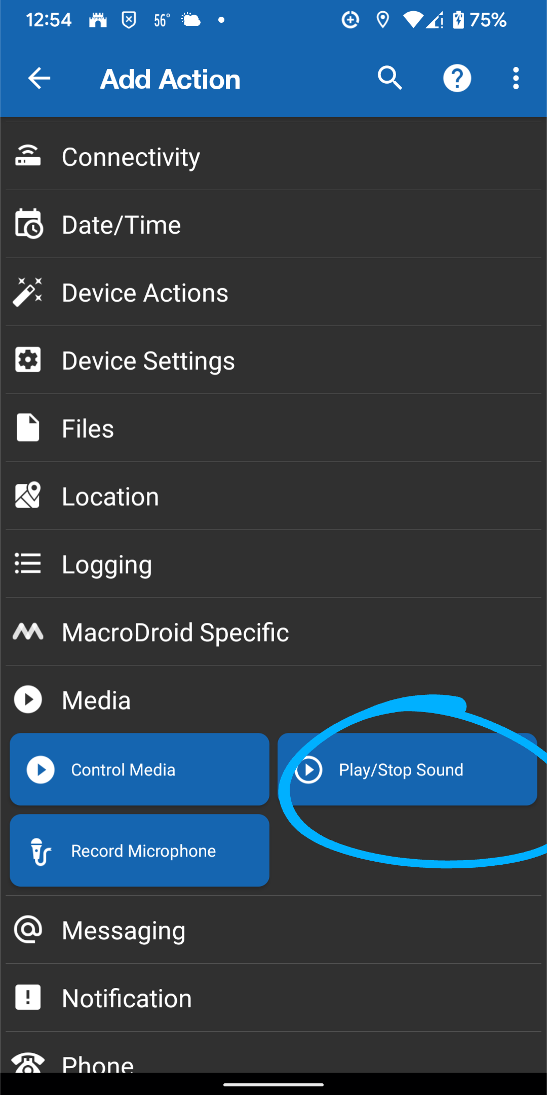 Setting up a macro for each cam was super easy. For my Garage Cam, I tell the macro to watch for any notification containing the words “Garage Cam” and to play a custom tone from my ringtone library when it comes in. Since the number of tones I have is limited by only the number I want to download, it is limitless. 100 cams = 100 tones. Or record your own. And, it isn’t limited to cams. Any notification from Wyze, so long as it states the device name, can be set for a custom tone. And that’s not all. It can trigger the phone to vibrate, flash the LED, open the app, send a SMS Text, send an email, send a tweet, trigger another app to do something, tons of action options (see the screenshot list below)