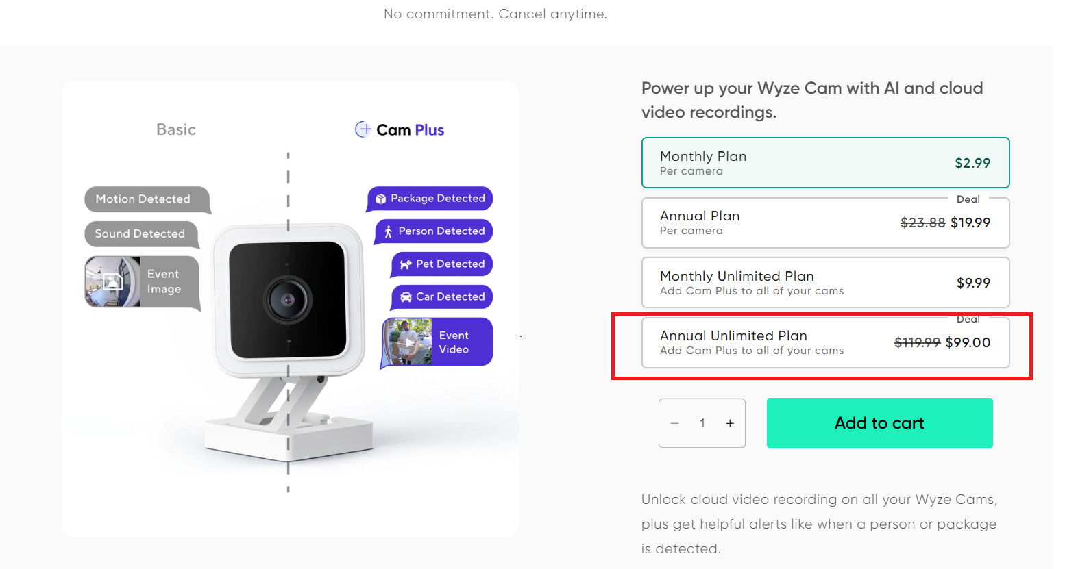 I purchased the Cam Plus annual unlimited plan last year. It is $99.00 for up to 99 cameras. It cost about 28 U.S. cents a day. One issue with Cam Plus is it auto renews and if you cancel it prior to the expiration date there is no refund for unused portion.