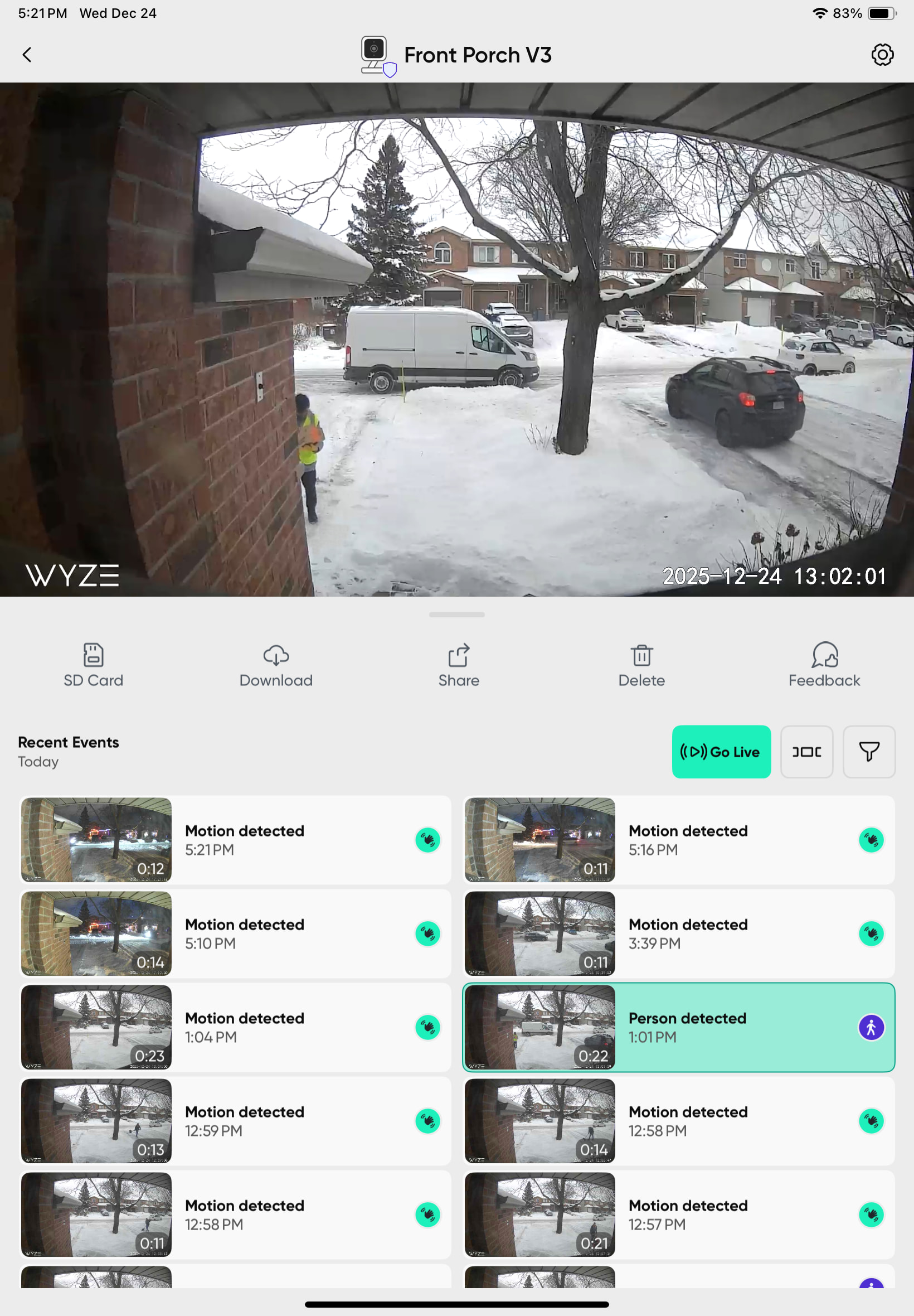 Set up the OG cam at front door. The micro sd card set to record continuously as I don’t trust cams to record complete events. The camera completely missed two deliveries today leaving a gap on the sd card continuous recording. I have installed a V3 as well there to capture what’s missed by the OG. Two pics show OG gaps in continuous recording. 3rd pic shows V3 event / delivery missed by OG