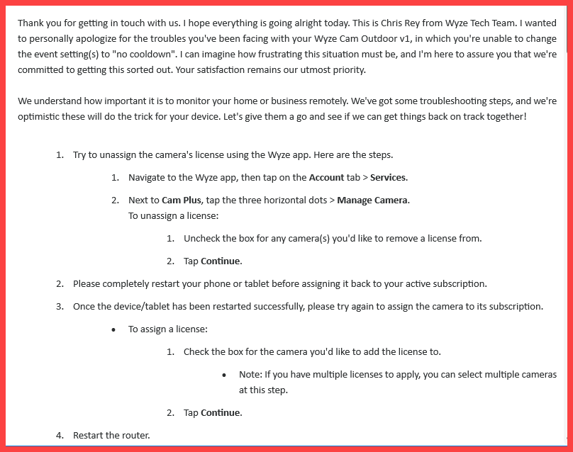 After going around in circles with the Wyze bot and an uninformed Support person on December 15, I received this lovely message from Louise.