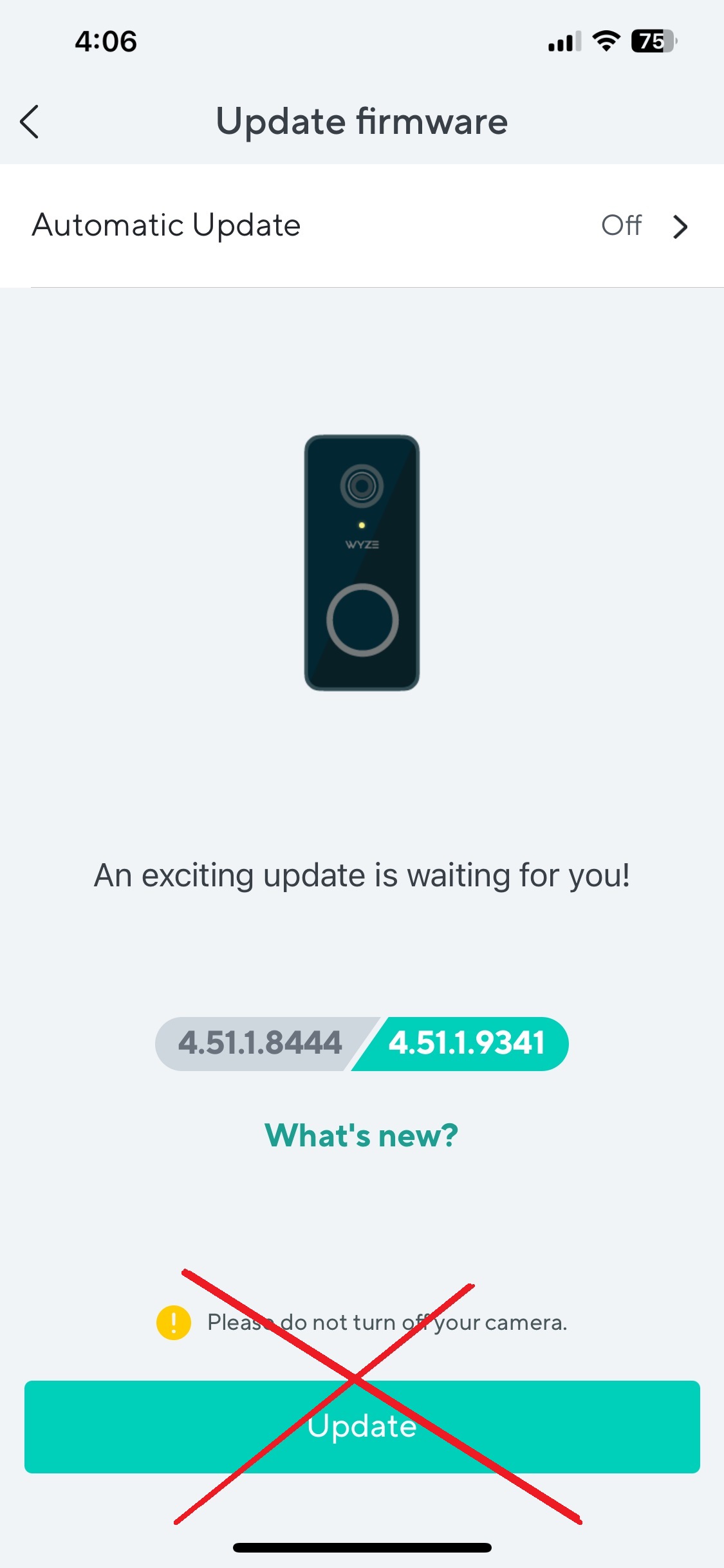 You have option to “Update now” or “update them all at once”. Since I don’t know which version it will update to for “Update now” option, I closed and restart the Wyze app. After app started, click on the doorbell from Home panel. But before it got a chance to load the live view (and update pop up screen), click on settings (gear icon) → Device Info → Firmware Version.