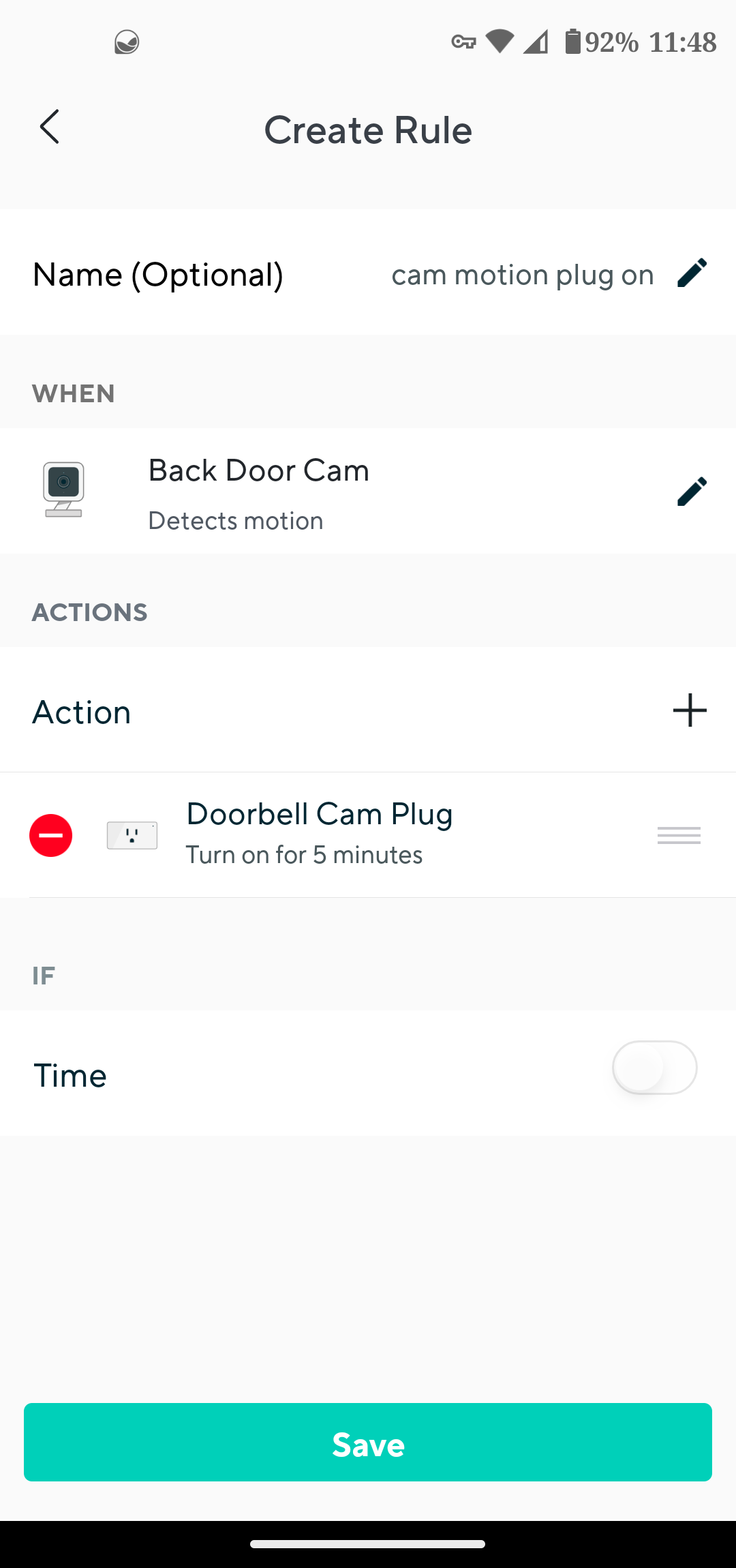 Thanks for the example, I really appreciate it. Actually I already figured it out. Pretty simple. Did a check and all works fine! Set duration for 5 minutes. The V3 is outside and aimed at some kayaks which I’m too lazy to take in for the winter. The plug will be attached to a spotlight aimed out a window.